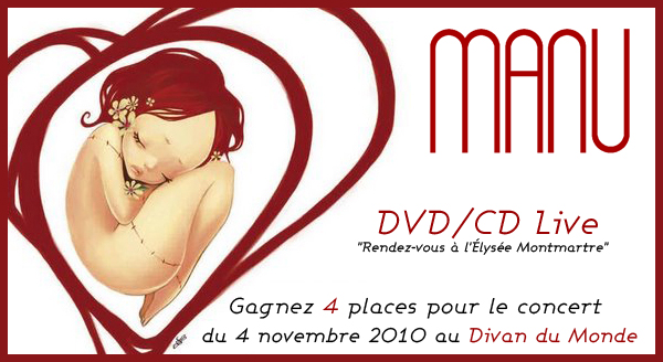 A l’occasion de la sortie de « Rendez-vous à l’Élysée Montmartre« , l’enregistrement CD et DVD qui vous permettra de replonger dans la tournée 2009 de MANU, Tekini Records et ADN Sound s’associe pour vous faire gagner 2 lots de places pour le concert au Divan du Monde le 4 novembre 2010.