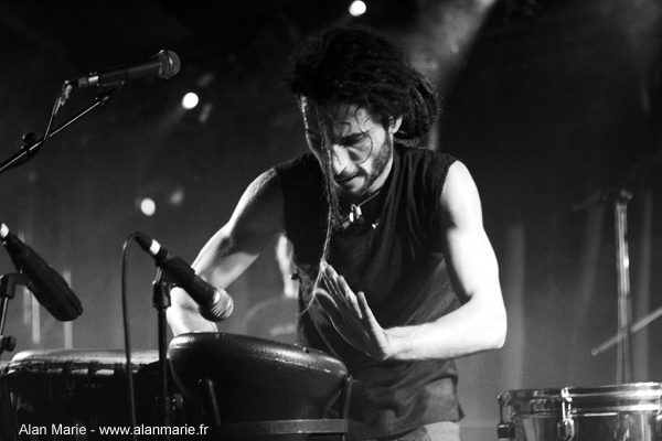 Je me poste près de la scène et vois arriver Goayandi avec sa formation efficace : batterie, basse, guitare, percus et didgeridoo. Le son commence à vibrer et les humains résonnent, le rythme de la grosse caisse démarre avec ses coups de marteau répétitifs, vraie marque de fabrique de style à part. Surpris moi-même lorsque je commence à bouger automatiquement mes petites fesses, je me concentre pour prendre quelques clichés. Ces mecs balancent, ça bouge sur scène, on n’est pas près d’oublier les sauts du souffleur de didgeridoo. Les influences sont multiples, Inde, Afrique, Australie, des terres riches de rythmes et d’expériences.