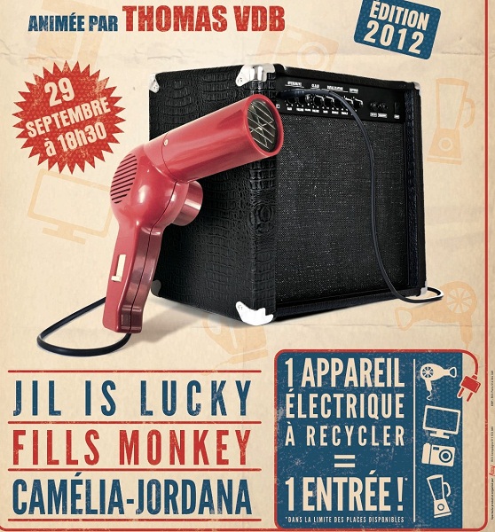 Donc, plutôt que de laisser s’entasser nos vieux bidules dans les tiroirs, autant s’en débarrasser. Le principe est simple : 1 appareil électrique à recycler = 1 entrée. La soirée du 29 septembre, animée par Thomas VDB, journaliste et humoriste, sera musicale. Au programme, Jil is Lucky, remarqué il y a 3 ans par son premier album et un deuxième en préparation, Camelia-Jordana et les Fills Monkey, les trublions de la batterie.