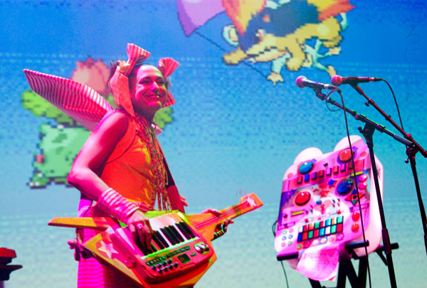 On assiste donc à un concert doublé d’une performance multimédia unique. Missill passe son temps entre la Game Girl et sa Keytar, un clavier customisé avec des ailerons tous droits sortis d’un anime japonais. Les morceaux variés mais toujours entraînants de son nouvel album s’enchaînent rapidement : Feel that bit, Glitter, Be more, Magic Potion… Les invités défilent les uns après les autres, rappelant parfois les concerts des géniaux Gorillaz.