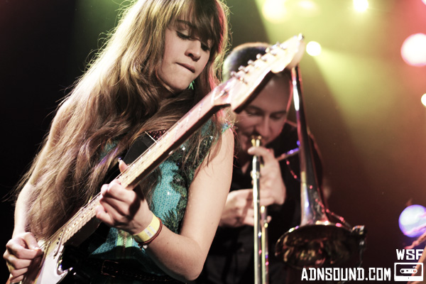 Perchée sur 12 cm de talons, elle embarque tout le monde dans son univers résolument soul et blues. De références en références (certaines mauvaises langues diraient « plagiats », mais on n’est pas comme ça), depuis Stevie Wonder à Clapton, elle nous ramène dans des époques passées et ô combien regrettées. Évidemment, il ne faut pas se leurrer, on est bien loin des noms cités plus haut. Mais c’est tout de même bien exécuté. Les cuivres (trois, puis cinq à la fin du concert) et la basse groovy ont beaucoup de charme.