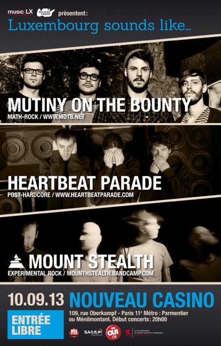 Au programme des festivités, du Post-Hardcore avec HEARTBEAT PARADE, du Math-Rock avec les MUTINY ON THE BOUNTY dont nous vous avions déjà parlé, du Rock expérimental avec MOUNT STEALTH et enfin de l’Electro-Punk avec GREEN VAUGHAN. De quoi passer un bon moment au son du Grand-duché !