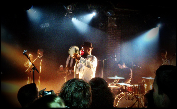 Quand enfin les lumières s’éteignent, on se croirait projetés cinquante ans en arrière, au cœur des sixties, quand l’élégance rimait avec le groove. Kelvin Swaby, smoking, nœud pap’, chapeau et micro rétro entre, suivi de ses musiciens et de deux joueurs de cuivres. Une classe à couper le souffle ! L’intro de Can’t play dead, voix électrique et ambiance morbide nous mettent dans l’ambiance de ce troisième album si écouté : The Glorious Dead. L’étroitesse de la salle de La Maroquinerie donne l’impression d’être sur scène avec ces drôles de bonshommes, qui dégainent trompettes, tambourins ou mégaphones. Le troisième morceau, à peine entamé, déclenche une avalanche de cris : Sixteen, qui – pour moi – est le morceau qui les a révélés il y a trois ans !