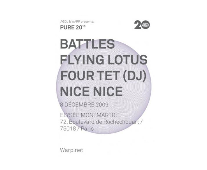 Au programme de cette « pure » soirée, ce sont les jeunes pousses qui seront à l’honneur. Battles, Flying Lotus, Four Tet et Nice Nice viendront donc tâter de la platine sur la scène de L’Elysée Montmartre en cette belle nuit du mardi 8 Décembre 2009.