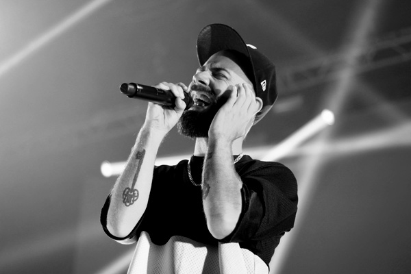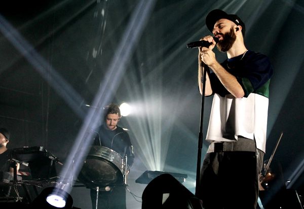 20h45, l’entrée du grand Woodkid se fait, de manière magistrale, planté devant un écran géant diffusant des images et animations en noir et blanc collant à son univers. Accompagné de 13 personnes : un sextet de cordes, un trio de cuivres, des batteurs et un steelpan (qui portera « Boat Song » à lui tout seul quasiment), il y a de quoi regarder, d’autant que le jeu de scène des musiciens est très bien exécuté. Tout est religieux. Les musiciens qui ne jouent pas restent immobiles, visage fermé. Sans oublier le gros travail de lumières, lesquelles mettent merveilleusement bien en valeur l’ensemble du groupe. Il y a des moments où votre corps est parcouru de frissons et vous restez la bouche ouverte « waouh ». Le public est en liesse. Il est rare de voir les gens bouger du premier rang jusqu’en fond de salle mais ce fut le cas ce soir et cette communion fut magnifique.