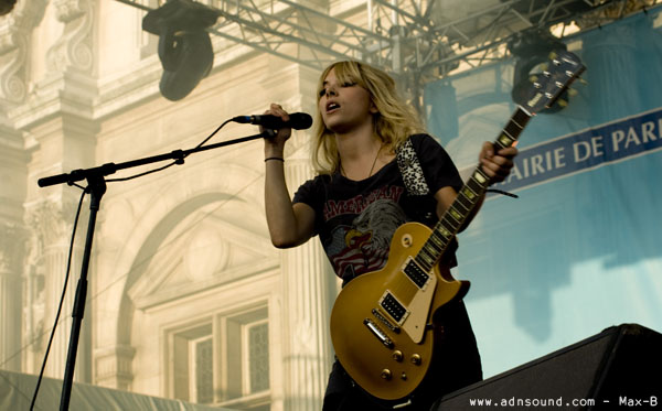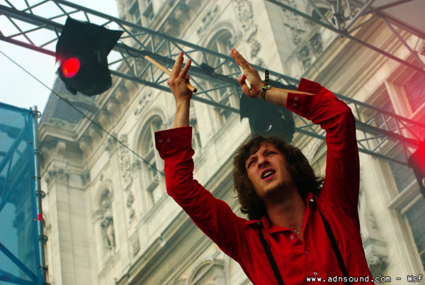 Un peu de féminité que diable, voilà qu’apparaissent sur scène quatre filles aux jambes interminables … Franges, Leggings et T-Shirts surtaillés … pas de doute ce sont les Plastiscines ! Visuellement c’est un régal, les filles s’éclatent et ça se sent … musicalement je suis plus sur la réserve, ce qu’elles nous ont offert ce soir nous a malheureusement parut trop brouillon bien que sincère … moins carrées que lors de leur passage à la Boule Noire, ils semblent que nos gravures de rock ait encore à maturer leur approche de la scène … A leur décharge, rappelons que les conditions d’un festival ne sont jamais évidentes à gérer surtout quand la foule est composée de curieux néophytes ! … NB : « Pour ceux qui ne nous connaissent pas nous sommes un groupe de Rock’n’Roll … » … désolé c’était trop mignon !