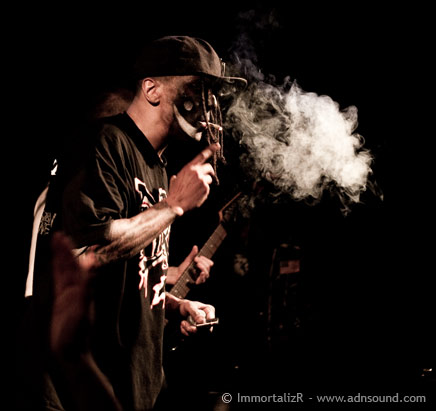 Passée cette première partie qui ne restera pas dans les annales, c’est à Hed Pe de faire son entrée sur scène, dans une mise en scène à l’américaine (voix scandée en fond sonore en intro de « New world Orphans », poses statiques, maquillage,…). Une chose est sûre : les 5 gaillards possèdent un charisme ahurissant et en imposent sans même avoir besoin de jouer. Le leader Jahred balance alors son flow mi hip/hop mi hardcore si particulier qui nous donne immédiatement envie de se déchainer et de rentrer dans son univers. Son visage, pourtant caché dernière son maquillage noir terrifiant, témoigne clairement de son plaisir d’être de retour sur les planches parisiennes, ce qu’il ne manquera pas de nous faire remarquer à maintes reprises.