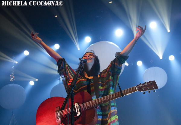 Viens le tour des nombreux Of Monsters And Men. Deux pianos, une batterie, des guitares, un accordéon, une basse, un tambour, un clavier, des cuivres… Et 7 musiciens souriants, Nanna et Ragnar en tête. Les fans sont légèrement hystériques, un « I love you » fuse même dans la salle. La chanteuse, Nanna, réponds par un « Thank you, we love you too » fluet. Mais quand il s’agit de chanter, l’Islandaise sait donner de la voix, version poétique et aérienne d’une Florence + The Machine. Sur King And Lionheart, son timbre fragile mais profond prend toute son ampleur, soutenu par la voix aiguë du chanteur Ragnar. Tous les titres de leur album My Head Is An Animal, sorti fin avril 2012 en Europe, ont été balayés pendant 1h30 pile de show, dont leur tube Little Talks. Mais d’autres sont à l’honneur: en rappel, ils reprendront Skeleton des Yeah Yeah Yeahs.