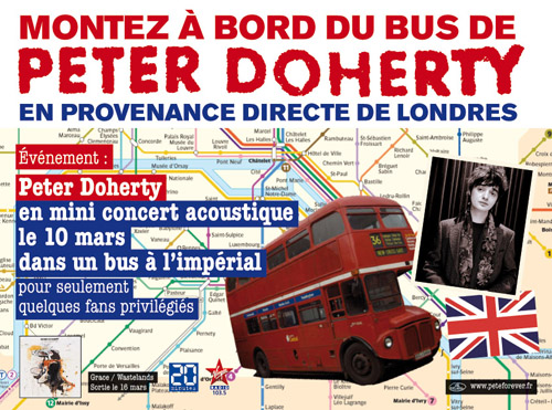 Si vous vous baladez à Paris dans la journée du 10 mars, vous aurez peut être l’occasion de croiser un bus anglais arpentant les rues pavée de notre vielle Lutèce. Il n’est point question de renfort anglais pour soutenir le trafic de la Ratp, c’est en fait le plus que médiatique Peter Doherty qui donnera un concert acoustique d’une heure.