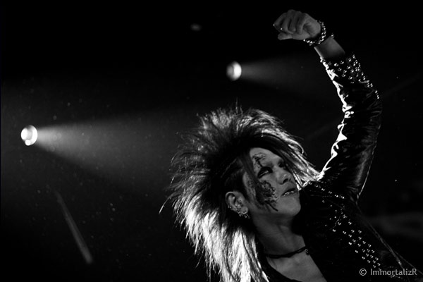 Et c’est partie pour du lourd, et oui tout n’est pas dans le style!. Musicalement Unsraw ne nous surprend pas mais ils ont le mérite de bien faire ce que nous connaissons déjà.  Une batterie puissante oscillant entre rythmes saccadés très rapides et  des sections plus calmes, sans aucune faiblesse, des solos de guitares mélodiques harmonieux et un chant gutturale rageur de succube hystérique. Ça pogote royalement sur 9 et ça allume les briquets sur Gate of death. Le chanteur nous fait découvrir sa gamme d’aigus et une voix chantée qui n’est malheureusement pas toujours à la hauteur. Mais à vrai dire ont s’en fichent, les Nippons assurent un show survolté. « call me, call me!! » Se donnant des allures de Rock star mégalomane Yuki réclame que l’on hurle son nom. Il crache allègrement des litres d’eau sur une audience transcendée, et slame sur pratiquement chaque titre, agrippant chaque mains levées afin de les rapprocher un peu plus de la scène. Une interaction rare totalement appropriée et qui nous réjouis amplement.